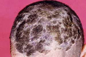 4、皮损特点:白癣较初症状为散在的小片,然后逐渐扩大,周围可有小的卫星样损害,表面覆有细小的灰白色鳞屑,发根部有一白色的鞘膜,头发通常在离头皮2-3mm处折断。黄癣初起症状则为小脓疱,干后会形成黄痂,呈碟状,皮损逐渐融合增大,甚至可以盖满整个头皮,其下呈鲜红色的糜烂面或浅溃疡,病发干燥、无光、弯曲歪斜,但不一定折断。黑癣的皮损约黄豆大小,常疏散分布,病发出头皮即断,所以留下许多小黑点。