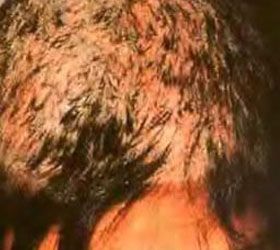 但是白癣的临床症状与黑癣不尽相同。白癣患者的头皮上可见边缘清楚的圆形灰白色斑块,上面覆盖着较厚的灰白色鳞屑,头发变成灰白色,失去光泽。患处可见高低不齐的断发,残留的断发很易拔出,患处头皮有不同程度的瘙痒。