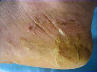 2、鳞屑角化型:此类型脚气发病初期会出现丘疹或水疱,发病比较慢,水疱位置也相对浅,少数患者会继发细菌感染,疱壁易破形成脱屑,痒轻,病程反复迁延者还会出现角化增厚,往往双手受累,甚至还会危及整个手掌甚至是手背,皮损特征为局部皮肤粗糙增厚,少汗,明显的角化过度伴有脱屑,由于皮肤粗糙肥厚容易出现皲裂,疼痛。